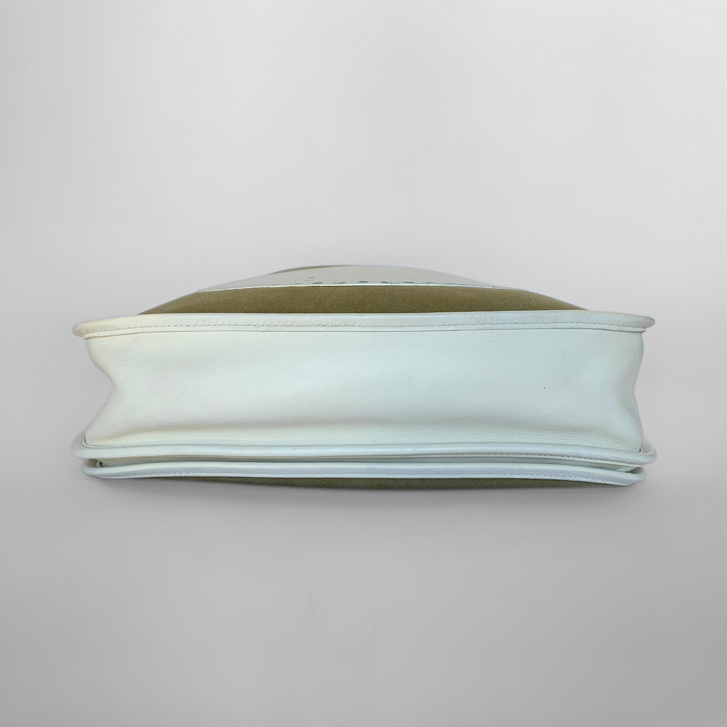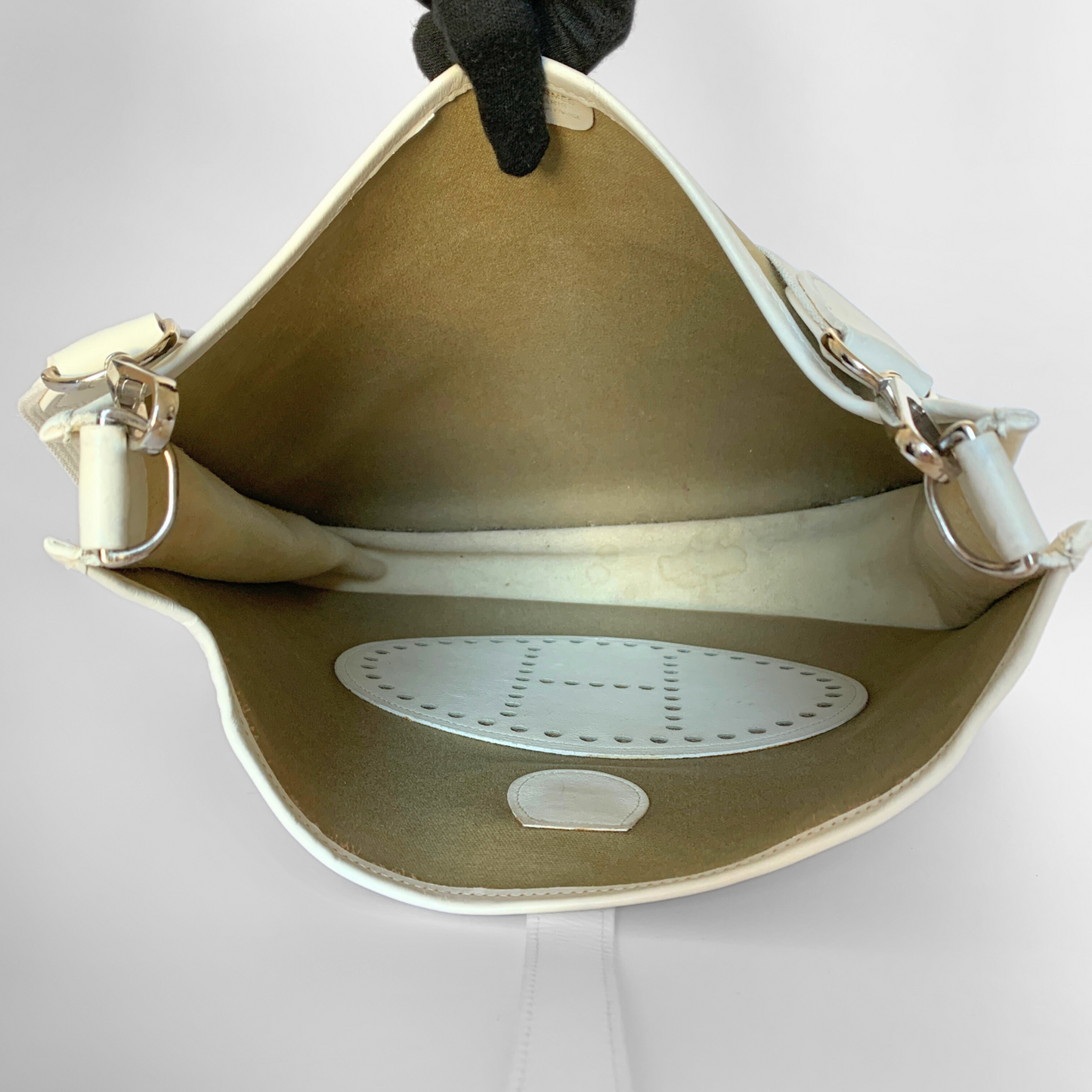 Hermès Evelyne GM, in white Leather with beige canvas. Did you know the Evelyne was created in 1978 by Evelyne Bertrand, head of Hermès Riding department, as a carry-all for horse groomer’s tools? The bag got perforated so brushes and sponges could dry on the go! Though the perforated side is intended to be worn against the body, the H logo has become a coveted design element for luxury lovers.