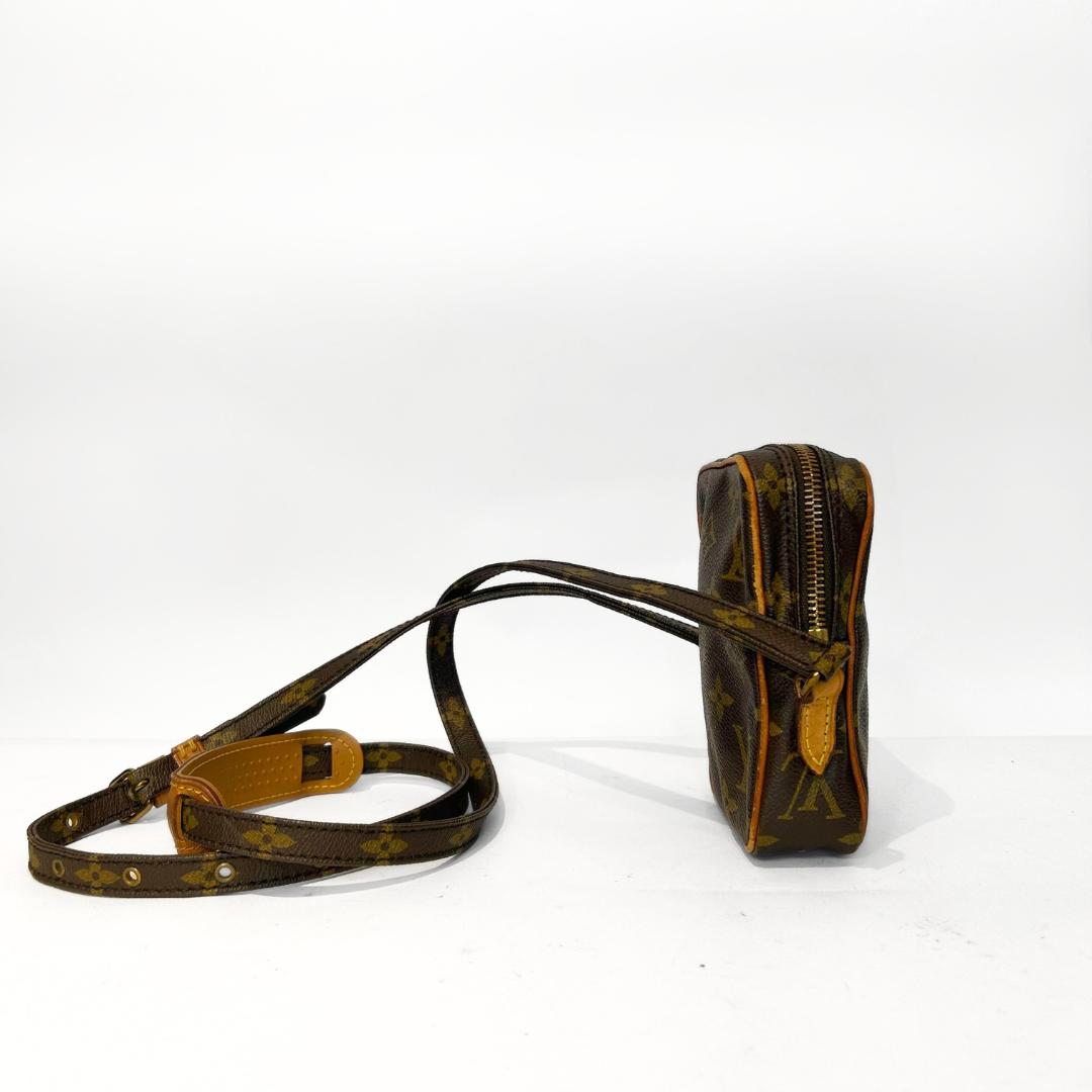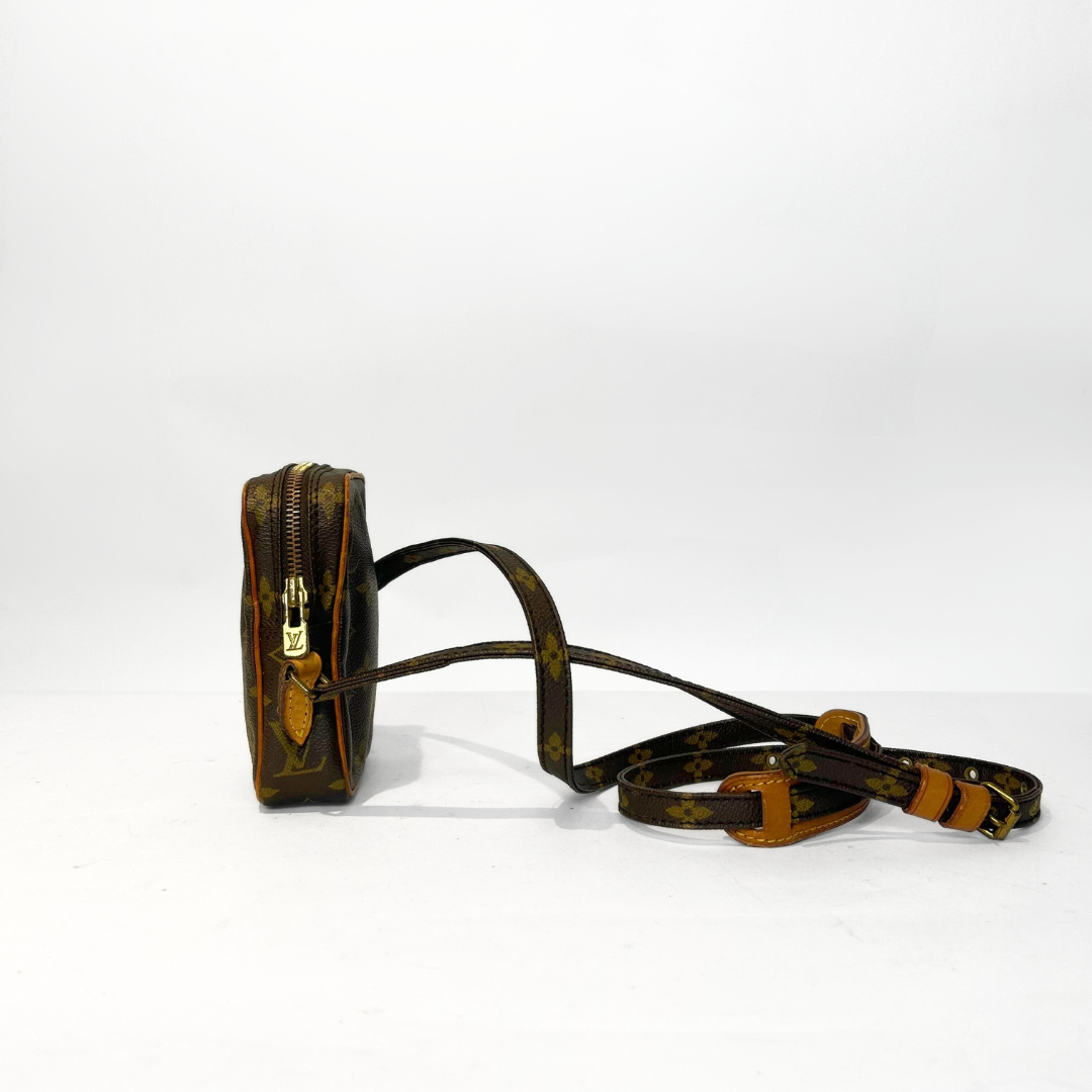 Louis Vuitton Danube Mini in Monogram Canvas. The bag has Vachetta leather details and gold-colored hardware. The classic Monogram Canvas has been Louis Vuitton's trademark design since it was first introduced in 1896. The graphic symbols, including the quatrefoils and flowers, as well as the LV Monogram were used to prevent counterfeiting in the early days when it was first patented. Made of coated canvas, the Monogram's traditional look is also endured by its durability.