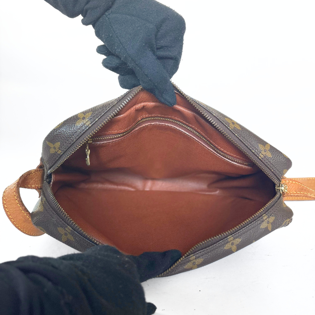The overall condition of the bag is good, the canvas is still in good shape. However, the Vachetta leather of the straps and closures shows some small scratches. The hardware has some dark spots and the zippers have discoloration. The bag has some green spots behind the clasp because of the clasps discoloration The inside of both slip in pockets are in good condition. The inside of the main compartment is still in good shape. This item comes with an authenticity card from our store.