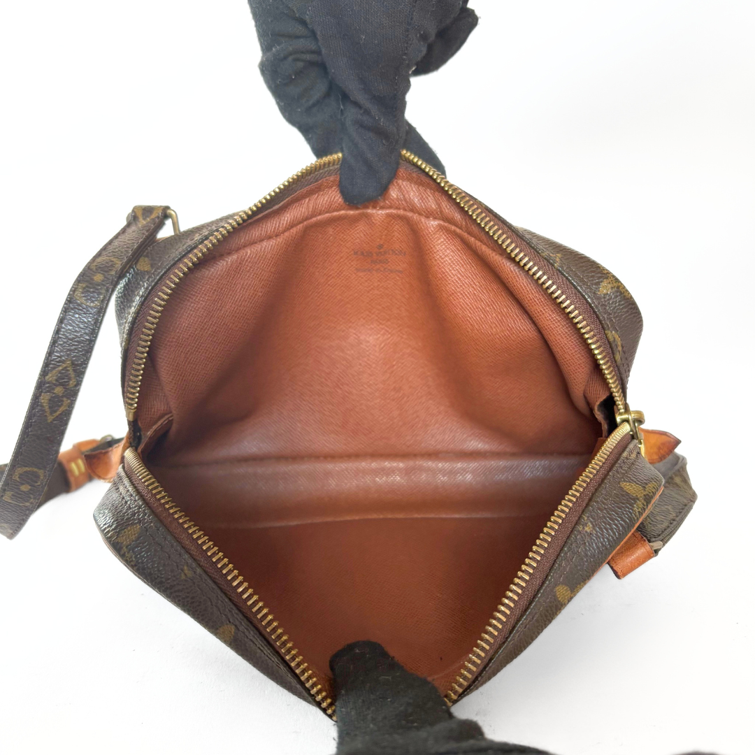 The bag has gold-colored hardware and opens with a zipper. The main compartment has no extra pockets. The strap has the same monogram print as the bag and the monogram strap is adjustable.