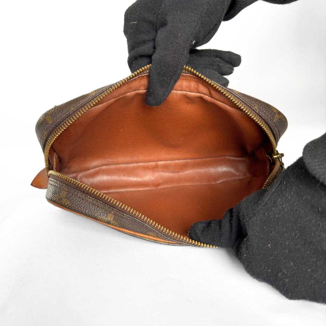 The bag has gold-colored hardware and opens with a zipper. The main compartment has no extra pockets. The strap has the same monogram print as the bag and the monogram strap is adjustable.
