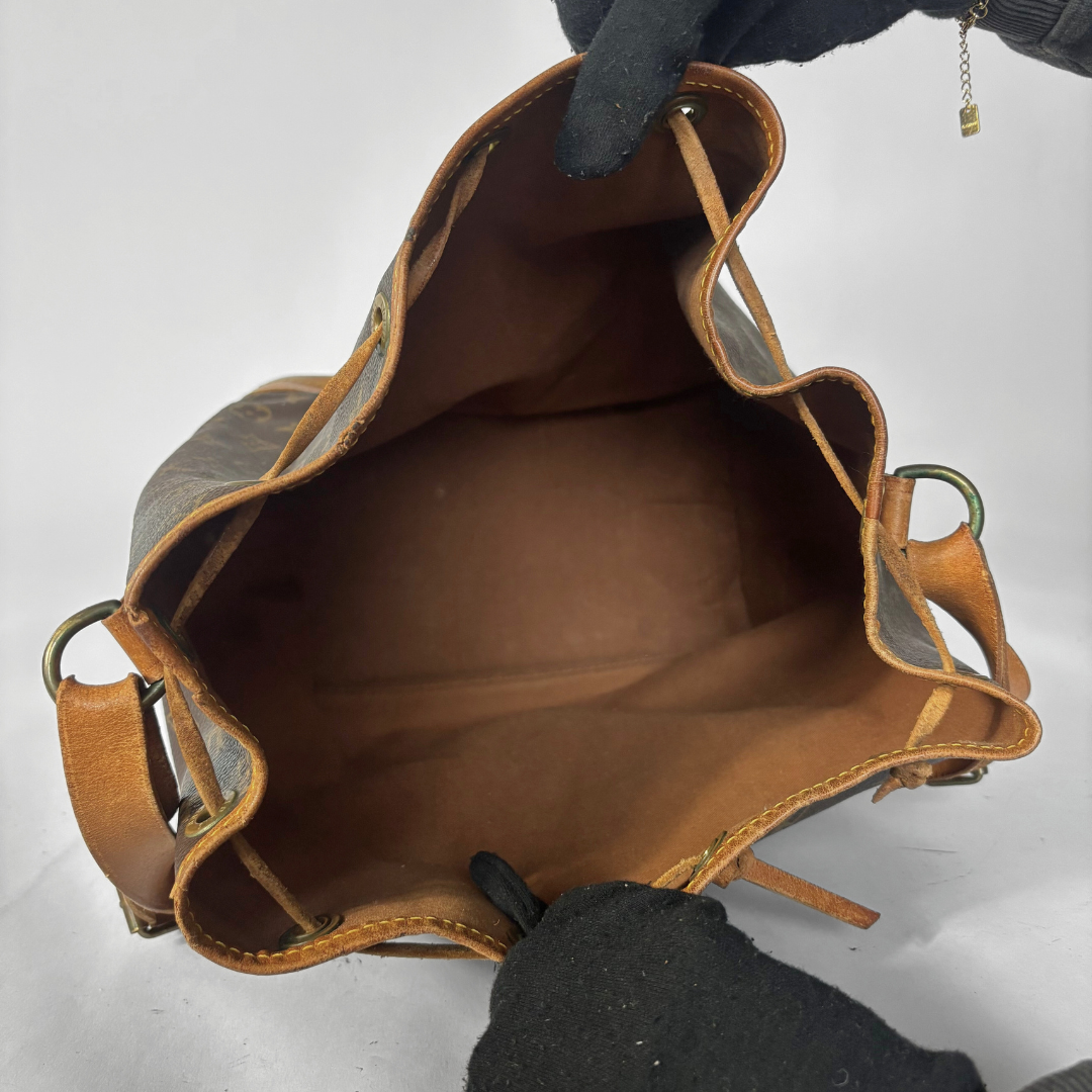 Louis Vuitton Noé Monogram Canvas. Noé was created in 1932, along with other Louis Vuitton icons the Alma, the Keepall and the Speedy. The Noé was designed to literally be a “bucket-shaped bag” which could carry four upright bottles of champagne and a fifth upside down in the center. The drawstring would secure the bottles from rattling around.