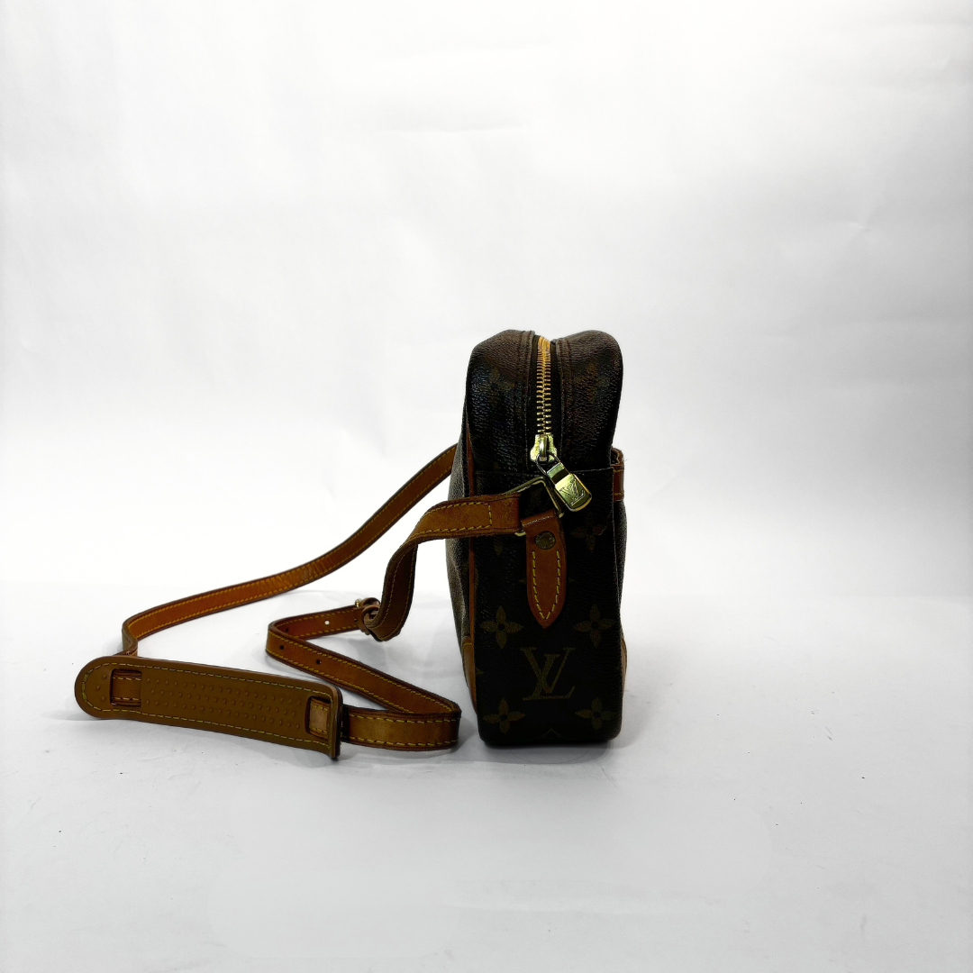 Louis Vuitton Trocadero PM in Monogram Canvas. The crossbody bag has Vachetta leather details and a leather shoulder strap. The strap is adjustable at seven points. This bag can be worn both as a shoulder bag and as a crossbody bag. The hardware is gold-colored. The main compartment closes with a gold-colored zipper. The inside lining is made of leather and contains a zipper pocket. On the front of the bag there is a slip-in pocket. This bag is perfect for everyday wear and big enough to hold all your daily essentials.